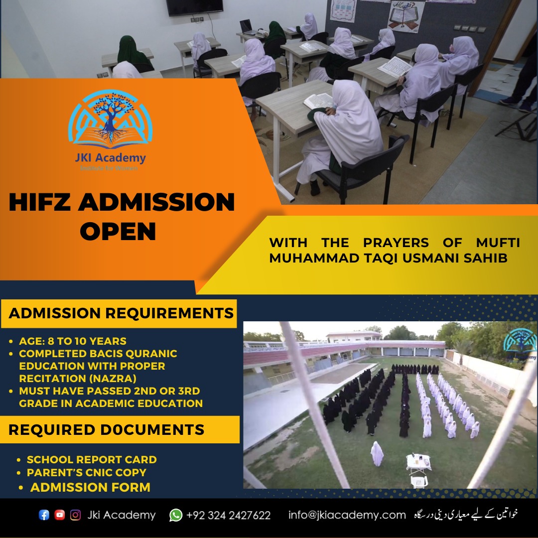 JKI Academy, a dedicated Islamic institute for women, is now accepting admissions for the new session. We offer a range of Islamic and educational programs designed to nurture faith, knowledge, and personal growth.