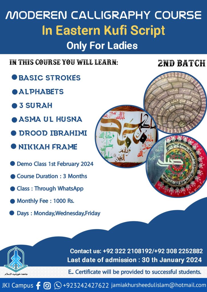 Courses Modern Calligraphy Course For any Query: Contact# 03082252882 D24/1,block 17 near National stadium Gulshan iqbal.karachi. info@jkiacademy.com Classes will…AdminFebruary 20, 2024