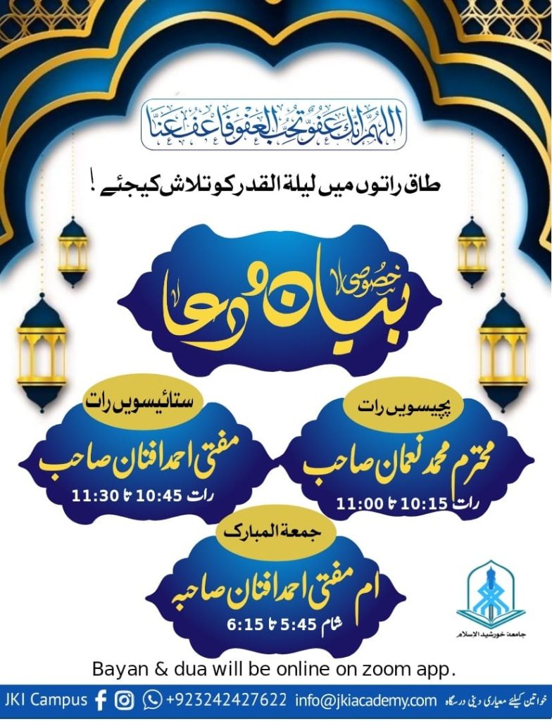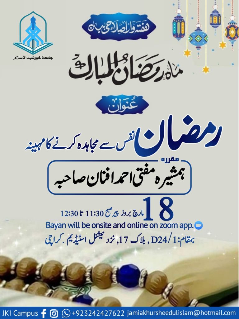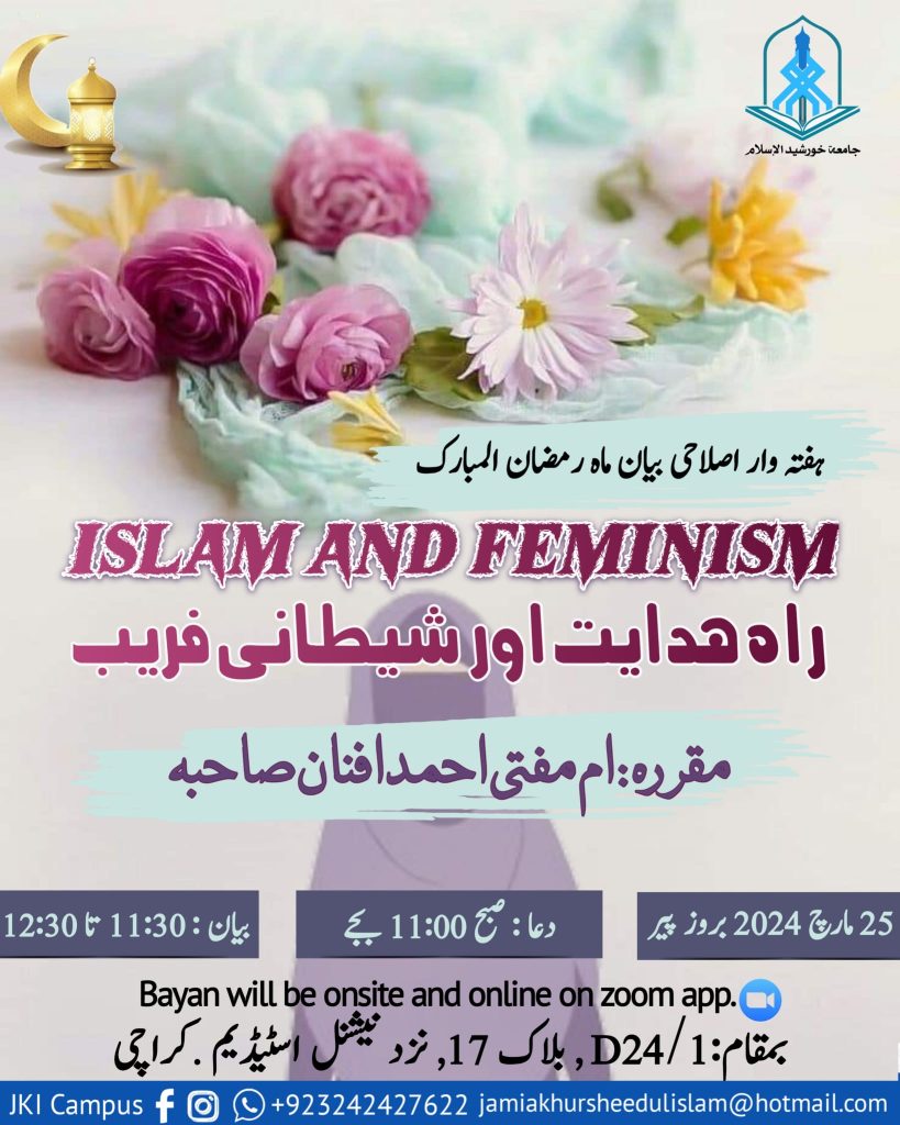 Event Ramadan Bayan ( Islam & Feminism) For any Query: Contact# 03082252882 D24/1,block 17 near National stadium Gulshan iqbal.karachi. info@jkiacademy.com AdminMarch 21, 2024